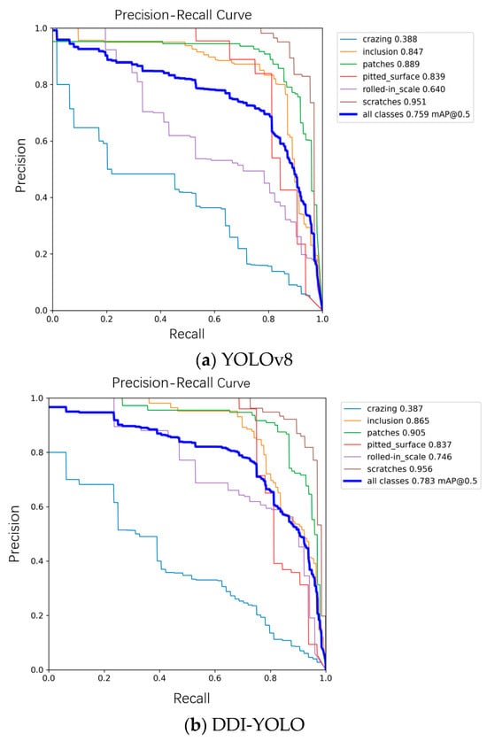 To further learn about the detection capability of our proposed DDI-YOLO and baseline model YOLOv8n, the P–R curves of the two methods are shown in Figure 6a,b. The region enclosed by our proposed DDI-YOLO was to be greater than the region enclosed by YOLOv8. The NEU-DET dataset’s overall mAP was 78.3%, which was a significant improvement of 2.4 percentage points over YOLOv8n.