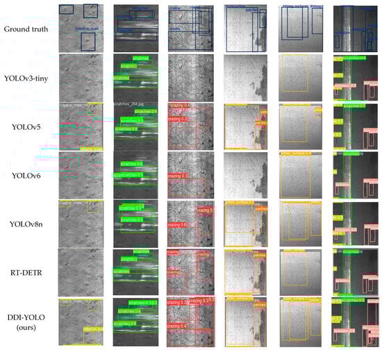 As it can be seen from Table 1, after replacing C2f in the backbone network with C2f_DWR, except for a slight decrease in recall and FPS, the rest of the metrics, such as mAP and precision, improved, with the mAP item experiencing a notable upgrade of 2.5 percentage points which was attributed to the excellent ability of DWR to extract the multiscale contextual information and then fuse the wildly formed by the multiscale fields into the feature maps, with a decrease in the number of parameters and computational effort. After substituting the C2f structure in the main network with the C2f_DRB structure, the DRB reparameterization module used a non-inflated small kernel and multiple inflated small kernel layers to augment a non-inflated large kernel convolutional layer, an approach which greatly reduced the number of parameters and significantly increased mAP and FPS, as well as FPS to 104. This was because DRB compensated for the inability of Cf2 to capture small-scale patterns between training sessions, thus improving the model’s training and detection capabilities. Then, after substituting the loss function of YOLOv8 with the Inner-IoU loss function alone, while not affecting the size of the model parameters, there was a notable increase in accuracy, mAP, and FPS, with a 5.4% increase in accuracy, a 1.5% increase in mAP, and a 9% increase in FPS. Therefore, our improvement not only optimized the speed of the model, but also enhanced the detection of defects by the model, the average accuracy rate, and the speed of defect detection, indicating that our improvement is effective. The fourth set of experiments entailed the DWR module and the DRB module being combined to form a new C2f_DWR_DRB structure and, from Table 1, we can see that, except for the recall rate having declined, all other indexes experienced a great improvement, with the precision rate, mAP, and FPS improving by 2.1%, 4.6%, and 27%, respectively. The most obvious improvement was that experienced by the mAP and FPS indexes, as well as the quantity of calculations and the number of parameters. There was a decrease in the number of calculations and the number of parameters, showing that the C2f_DWR_DRB structure combined the advantages of the two respective modules. Finally, our DDI-YOLO experienced a decrease in recall, but all other metrics remained optimal. In summary, the improvement method of the model put forth in this research works well.