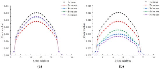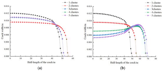 - When the cluster spacing is small, the mid fracture is greatly influenced by the edge fracture, resulting in a lower height and narrower width than the predetermined maximum values. As the cluster spacing increases, the width and height of the mid fracture increase, while the length decreases. The situation is the opposite for the edge fracture. The more clusters there are, the more pronounced the interaction between the fractures, especially the influence of the edge fracture on the mid fracture. With a larger displacement, more fracturing fluid enters the formation, resulting in an increased length, width, and height of the edge fracture. However, the mid fracture is influenced by the edge fracture, leading to a decrease in width and an increase in length.