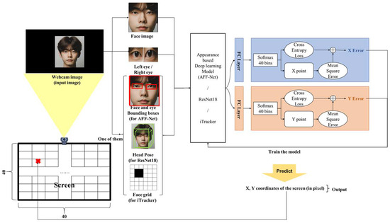Gaze estimation is a field that involves tracking the direction of a person’s gaze, allowing for the control of input devices such as a mouse or keyboard solely through eye movements [1] or as a reference to a consumer’s area of interest when creating ads [2]. Additionally, in virtual reality settings, it can predict user attention and analyze emotions to enhance device recognition [3]. Furthermore, in the field of human–computer interaction (HCI), user engagement can be indicated through gaze tracking in interactions with robots [4] and open dialogue systems. Various approaches have been suggested to enhance gaze estimation’s functionality and deliver enhanced user satisfaction. Classical gaze estimation methods relied on the numerical computations of facial features, including pupil size, distance between pupils, and the position of pupils relative to each other [5]. However, these methods proved inflexible in response to differing targets and environments. Once a numerical model was established for a specific target, it could not be utilized elsewhere. In the last decade, hardware capabilities have made significant progress, and the collection of extensive datasets such as MPIIGaze [6], GazeCapture [7], and Gaze360 [8] has given rise to deep-learning-based gaze estimation techniques. Appearance-based models have shown impressive performance in predicting gaze direction. For instance, FAZE [9] employs facial images and gaze direction as input, utilizing meta-learning on latent vectors to predict gaze direction. Additionally, a ResNet-trained model that uses images of faces and pairs of eyes has outperformed iTracker [7] in gaze accuracy. Another notable gaze estimation model, SAGE (fast accurate gaze tracker) [10], combines eye images and landmarks, demonstrating high effectiveness. These and many other types of research have been done on gaze estimation from facial images [11,12,13]. However, a significant obstacle to furthering these models is the limited availability of resources. High-performance models often require sophisticated deep architectures and significant computational resources, along with extensive datasets [14]. This creates a formidable impediment, hindering developers from deploying these models in everyday services and applications. This paper presents a computational framework for gaze estimation through regression analysis, utilizing ensemble loss functions to enhance efficiency. Our aim is to comprehensively estimate gaze coordinates while preserving computational resources. Our methodology enhances gaze tracking precision by integrating an ensemble loss approach within the deep learning framework. Specifically, we employ an ensemble of loss functions that not only evaluate the regression accuracy of the predicted gaze coordinates but also incorporate a multi-class classification scheme. By combining these distinct aspects of loss functions, our model effectively addresses both the precision of gaze coordinates and their categorical accuracy, leading to improved performance in gaze tracking applications. This innovative approach enables the achievement of highly accurate gaze coordinates by adjusting loss functions, eliminating the need for extensive network rebuilding, complex neural network training, or the accumulation of immense datasets tailored to a specific deep neural network. Our proposed framework reduces computational and resource expenses and enhances resource efficiency significantly. Additionally, there have been advancements in appearance-based models for predicting gaze direction in 3D angles and forecasting standardized X and Y coordinates on a 2D plane [15,16]. These advancements are applicable to various devices, including laptops, smartphones, and tablet PCs. As the field progresses, this research contributes to the enhancement of gaze estimation techniques, providing a practical and resource-efficient solution with broad applicability. This approach is akin to the method proposed in the previous work [17], where the squeeze-and-excitation network (SE-Net) introduced SE blocks that could be applied to various existing deep learning models to improve performance. In this paper, the effectiveness of ensemble loss applied as blocks to various existing gaze tracking models is experimentally evaluated. The overall structure of the proposed method is shown in Figure 1.