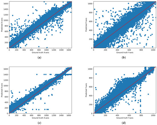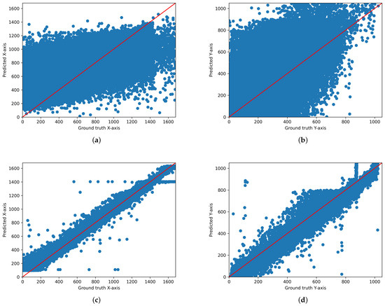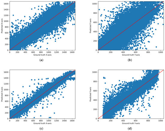 Scatter plot of the predicted and actual values on the x-axis and y-axis for AFF-Net. (a) Original AFF-Net (x-axis), (b) Original AFF-Net (y-axis), (c) AFF-Net with ensemble loss function (x-axis), (d) AFF-Net with ensemble-loss function (y-axis). These graphs are displayed in pixel units at a resolution of 1680 × 1050.