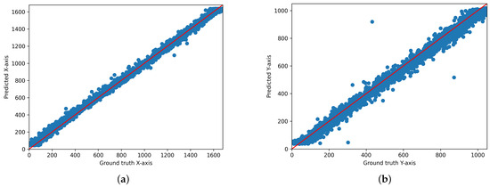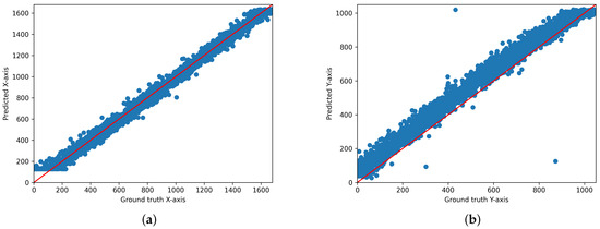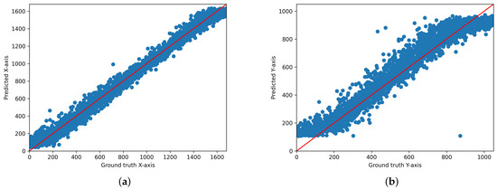 Scatter plot of the predicted and actual values of the x- and y-axis planes of the two-dimensional gaze coordinates predicted by applying the ensemble loss function to the existing iTracker for Person 6 ((a): x-axis, (b): y-axis).