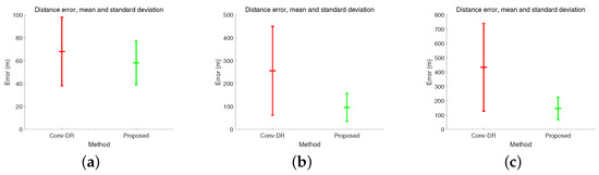 Comparison of distance error, mean, and standard deviation in region (3): (a) has a data reception period of 0.1 s; (b) has a data reception period of 0.5 s; and (c) has a data reception period of 1 s.
