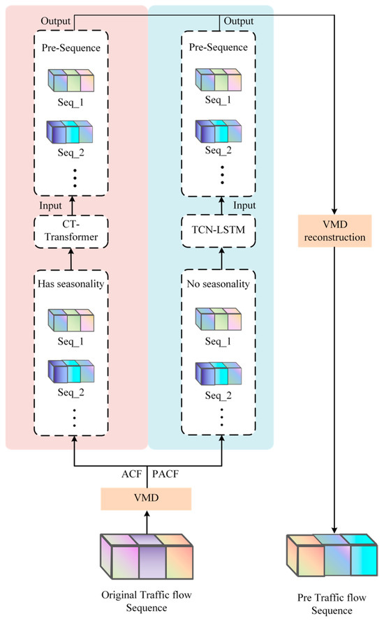 This study introduces a model architecture integrating Variational Mode Decomposition, the CT-Transformer, and TCN-LSTM for analyzing non-stationary traffic flow data with time-series characteristics. Variational Mode Decomposition is initially applied to segment the data into multiple subsequences. Subsequently, each subsequence’s autocorrelation and partial autocorrelation coefficients are analyzed to assess their seasonal characteristics. We propose replacing the attention mechanism in the Encoder module of the two-stage Transformer’s first stage with CPSNet-Attention to reduce computational costs and memory usage, thereby enhancing model prediction accuracy. We designate the refined model as the CT-Transformer.
