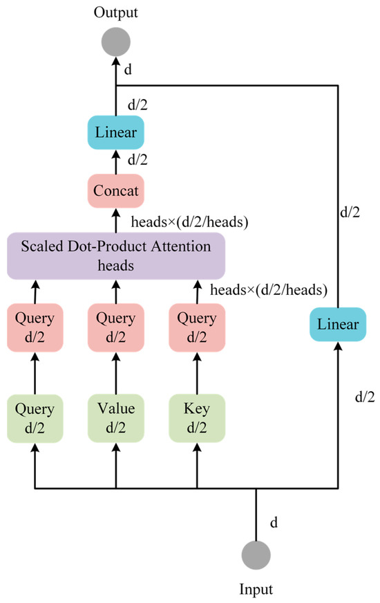 In the CSPNet-Attention framework, A(X2h) signifies the scaled dot product attention within the hth self-attention block, where Wh represents the dh × dh linear projection matrix. Here, H denotes the number of heads, dh specifies the dimension of each head, and Wc is the weight matrix for the one-dimensional convolutional layer, with dimensions d/2 × d/2. The formulation updates the weights within CSPNet-Attention as follows in Equation (5):