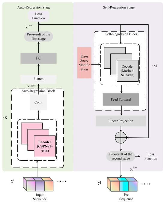 To further enhance model performance, this study substitutes the original self-attention mechanism with the CSPNet-Attention mechanism in the Encoder, augmenting the model’s capacity to capture sequence features. Moreover, the Two-stage Transformer incorporates an innovative Error Score Modification (EMS) module, employing a learnable Gaussian distribution N(0, σi2), where i ∈ [1, lout], to optimize the model’s prediction accuracy and robustness. Within EMS, the distribution’s center is set to zero, enabling the model to bias auto-attention score assignments towards earlier, more reliable predictive elements. Consequently, this approach amplifies the influence of earlier predictor elements on subsequent ones in the autoregressive process, thereby improving the model’s overall performance in time-series prediction.