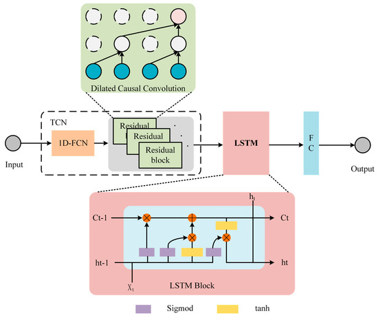 In LSTM, a connection exists not only between the hidden units ht−1 and ht but also in a linear self-loop between cell states ct−1 and ct. This linear self-loop mechanism, functioning as an information sliding process, retains past information when the gating unit is activated and discards it upon deactivation. It enables LSTM to address long-term dependency issues in RNNs. Considering the synergistic combination of TCN and LSTM, leveraging their respective strengths, processed time-series data are initially input into the TCN and subsequently passed through LSTM via convolution and residual block processing, with the final output derived from a fully connected layer. The TCN-LSTM model amalgamation aims to serve as a potent instrument for time-series prediction, with the TCN layer tasked with feature extraction and the LSTM layer dedicated to sequence modeling. This hybrid methodology enhances the model’s capacity to learn from data embodying complex temporal dynamics [37]. The overall network architecture of the TCN-LSTM model is shown in Figure 5 below: