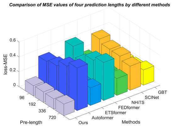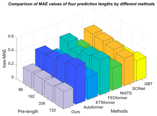The research presents the experimental results of the proposed model and the baseline models in Table 3, setting the prediction window to four distinct sizes: 96, 192, 336, and 720. The team conducted three experiments for each size to ensure stable experimental outcomes. The CT-Transformer outperforms the baseline models’ overall prediction performance, as demonstrated in the table. At a prediction window of 96, the CT-Transformer achieved relative reductions in mean absolute error (MAE) of 45.9%, 26.9%, 51.3%, 26.4%, 49.6%, and 8.70% compared with Autoformer, ETSformer, FEDformer, NHiTS, SCINet, and GBT, respectively. It also reduced the mean squared error (MSE) by 65.2%, 37.2%, 70.2%, 38.3%, 67.6%, and 14.4%, respectively. At prediction windows of 192, 336, and 720, the CT-Transformer similarly demonstrated significant reductions in MAE and MSE, showcasing superior accuracy and robustness over advanced time-series forecasting models. These comparisons are depicted in bar charts in Figure 7 and Figure 8, comparing the MAE and MSE values of the proposed fusion model with those of the baseline models across the four prediction lengths.