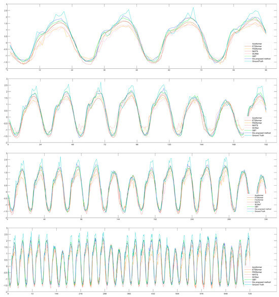 Comparative prediction results of different models at prediction window sizes of 96, 192, 336, and 720.