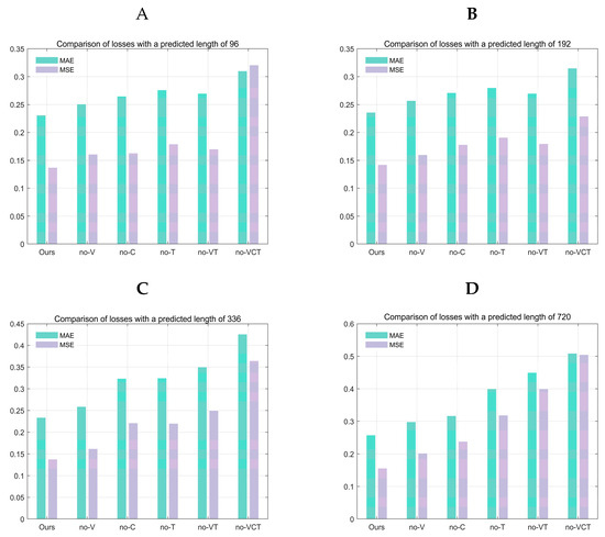 A in Figure 10 represents the results of the ablation experiment when the predicted window size is 96, B represents the results of the ablation experiment when the predicted window size is 192, C represents the results of the ablation experiment when the predicted window size is 336, and D represents the results of the ablation experiment when the predicted window size is 720.
