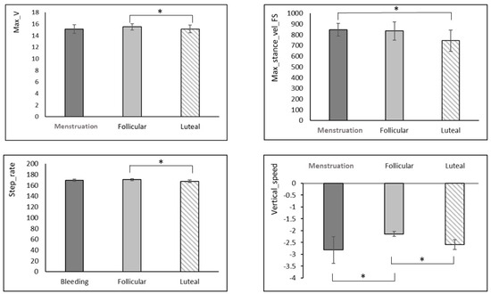Comparison of the significant effect of the menstrual cycle phases on kinematic variables of velocity and frequency. Max_V—Maximum speed in test (m/s); Max_stance_vel_FS—Maximum stance velocity from the foot strike to the point of maximum pronation (°/s); Step_rate (steps/min); Vertical speed (m/s); * = p < 0.05.