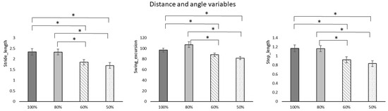 Comparison of the significant effect of test intensity on distance and angle variables. Stride_length (m); Swing_excursion (°); Step_length (m); * p < 0.05.