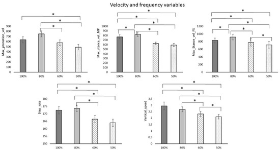 Comparison of the significant effect of test intensity on velocity and frequency variables. Max_pronation_vel—Maximum pronation velocity (°/s); Max_stance_vel_MP—Maximum stance velocity from the point of maximum pronation to toe-off (°/s); Max_stance_vel_FS—Maximum stance velocity from the foot strike to the point of maximum pronation (°/s); Step_rate (steps/min); Vertical speed (m/s); * p < 0.05.