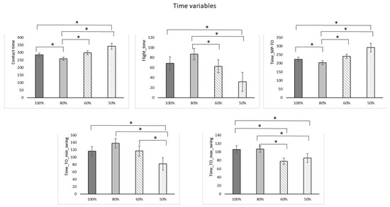 Comparison of the effect of test intensity on time variables. Contact_time (ms); Flight_time (ms); Time_MP-TO—Time from the point of maximum pronation to toe-off (ms); Time_TO_min_swing—Time from toe-off to minimum swing point (ms); Time_TO_max_swing—Time from the maximum swing point to the foot strike (ms); * = p < 0.05.