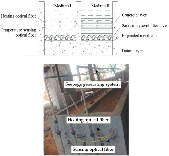 Two model sinks with 5 m length, 0.6 m width, and 1.15 m height were established in the experiment. The wall was filled with sintered ordinary bricks and built with M5 cement mortar, with M10 mortar smeared on the surface. A slope was set at the bottom of the model sinks to form seepage, with a slope of 1:3 and an outlet hole drilled to calculate the seepage velocity. On the basis of the vertical height of 5 cm, the steel plate mesh was arranged, and two layers of filter cloth were laid on the steel plate mesh to prevent the medium from being taken away by the seepage water. In order to make force on the steel plate mesh uniform and prevent the stress damage of the filter cloth, gravel with a 10 cm thickness and slightly larger than the mesh hole size was laid between the two layers of the filter cloth. A 5 cm gap between the steel plate mesh and the foundation was reserved, and an outlet hole was set at the end of the sink to discharge the seepage water. Three PVC semi-tubes with a diameter of 4 cm were set on the edge wall of the model sink to simulate the concentrated seepage inside the embankment. The optical fiber was arranged as shown in the Figure 4, and yellow sand and clay were used to fill the two model sinks, respectively, denoted as medium I and medium II.