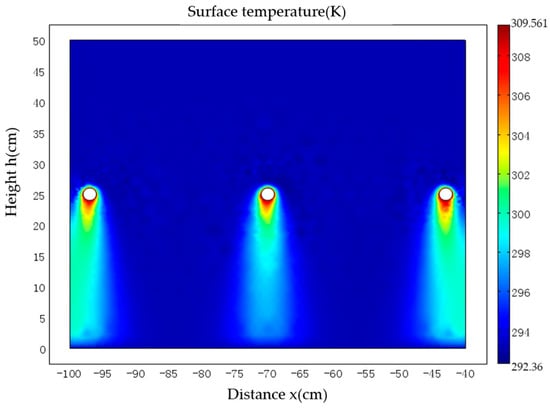 Figure 5, Figure 6, Figure 7, Figure 8, Figure 9, Figure 10 and Figure 11 show the temperature distributions of the porous medium under different seepage conditions calculated using COMSOL combined with the temperature–seepage coupling theory. Figure 5 and Figure 6 show the temperature distributions under no seepage conditions which are the initial state for later iteration. Setting the seepage velocity to 10−7 m/s, the temperature fields of the porous medium calculated using the measured temperature of the second optical fiber are shown in Figure 7 and Figure 8. Given the existence of the seepage field, the temperature fields are different from Figure 5 and Figure 6. Taking the error as , the difference between the calculated temperature and the measured temperature is beyond the error value, and a new velocity should be assumed until the error value is met. The final temperature distributions are shown in Figure 10 and Figure 11. The relative seepage velocity is which is the seepage velocity of the steady seepage condition. Figure 12 is added to highlight the difference from Figure 5, Figure 6, Figure 7, Figure 8, Figure 9, Figure 10 and Figure 11.