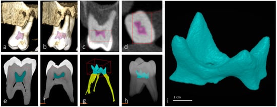 After exodontia, teeth were preserved in physiological saline solution at 4 °C until use for micro-CT study, which was carried out at the Centro Nacional de Investigacion sobre la Evolucion Humana (CENIEH; Burgos, Spain). The images were obtained with V|Tome|X s 240 from GE Sensing Inspection Technologies (Phoenix X-ray, Manufacturer: Baker Hughes, Celle, Germany), and for the analysis of the images, the software Dragonfly 2022.2 was used. The pulp canal was deleted from the rest of the tooth by adjusting the histogram. Once the pulp canals were isolated, a box was defined that corresponded to the region of the pulp chamber (Figure 1e–i). The software itself has a function that directly provides the volume value of the selected region (connected components; Figure 1i).