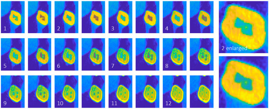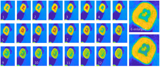 Images 1–12 in Figure 2 and Figure 3 correspond to different axial planes of samples 2 and 5, respectively. The portions corresponding to the pulp chamber are highlighted in blue, while the pulp chamber pixels detected by the algorithm are marked in red.