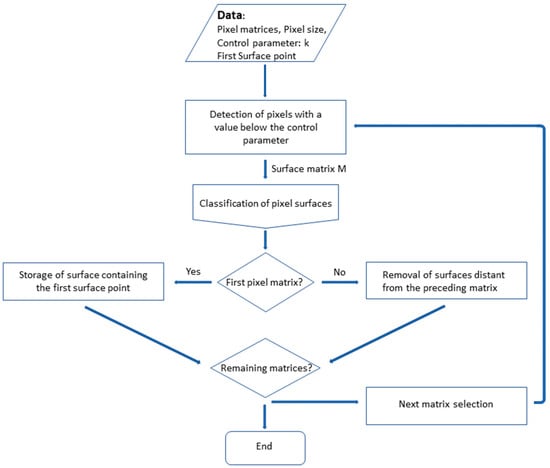 If it is the first image, only the surface containing the first surface point given as an input parameter is retained. If it is a subsequent image, surfaces far from those obtained in the previous iteration are eliminated. If denotes the j-th surface in the i image, then: