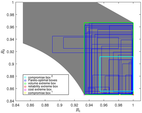 Figure 2 shows the Pareto-optimal box-shaped solution spaces. The green, red, magenta, and cyan boxes are the volume extreme solution, reliability extreme solution, cost extreme solution, and compromise solutions obtained by the ‘min-max’ method considering volume, reliability, and cost. For comparison purposes, the compromise solution considering only reliability and cost is also shown by the yellow box in Figure 2. Figure 3 displays the approximated Pareto-optimal front, along with its 2-D projections.