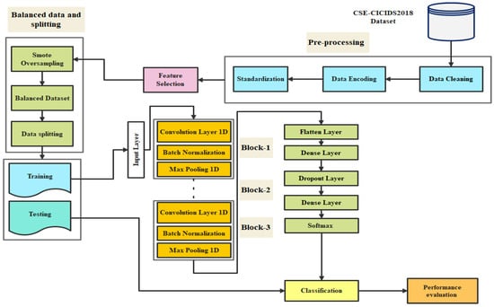 The proposed model introduces an efficient application of the convolutional neural network (CNN) paradigm for intrusion detection, utilizing the CSE-CICIDS2018 dataset. The proposed approach for intrusion detection consists of seven major stages, as shown in the following Figure 1.