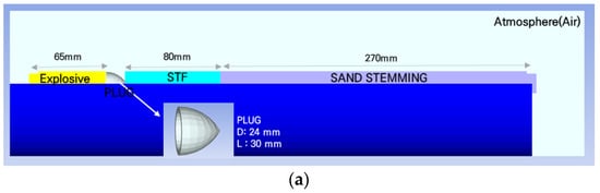 Comparison of the AUTODYN stemming effect between the sand and STF. (a) Only sand stemming and (b) STF and sand stemming.