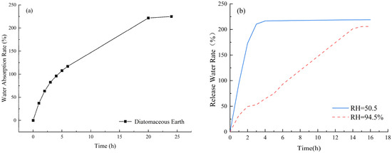 The water absorption and release performance of internal curing agents are crucial indicators for determining their efficiency. Water absorption determines the amount of internal curing water available for practical use, and a higher water absorption rate leads to more internal curing water being introduced. This, in turn, provides more water during hydration and evaporation, resulting in better shrinkage reduction in the slurry. The water release rate has a significant impact on the internal curing effect. If an internal curing agent has a high water absorption rate but a low water release rate, introducing it into concrete with a low water release rate or no water release would not only waste water resources and increase the self-weight of the concrete but also fail to achieve a good internal curing effect. Therefore, it is necessary to measure the water absorption and release characteristics of diatomite. Since DE is in powder form, with pores on its particle surface, its water absorption rate, measured using the tea bag method [31], is 230% of its mass, as shown in Figure 2a. By simulating the internal solution environment of cement mortar using potassium nitrate and a supersaturated solution of sodium bromide, and controlling the relative humidity at 94.5% and 50.5%, respectively, the water release performance of DE under different relative humidity conditions was measured, as shown in Figure 2b.