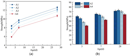 As can be seen from Table 2, when wet DE is used to replace cement to achieve the same flowability, it increases the internal curing water by 2% to 10% but also requires an increase in the dosage of water reducer by 0.01% to 0.04%. For concrete, strength is its most basic performance indicator and the primary consideration in structural design and quality inspection of construction work [34]. Therefore, even though the introduction of internal curing materials can effectively suppress shrinkage and cracking in cement mortar, it cannot be done at the cost of compromising the strength of the paste. As shown in Figure 3b, the early compressive strength of the mortar significantly decreases with the incorporation of DE. As the age increases, the compressive strength of the mortar continues to develop and gradually stabilizes, gradually approaching or even exceeding the compressive strength of the reference mortar during the same period. When the age is 28 days, the compressive strengths of groups A2, A3, and A4 increase to 102%, 98.6%, and 89.7% of the 28-day compressive strength of the reference mortar, respectively. This also indicates that the incorporation of DE slightly reduces the 3-day and 7-day compressive strengths of the mortar compared to the reference group but has a smaller impact on the 28-day compressive strength.