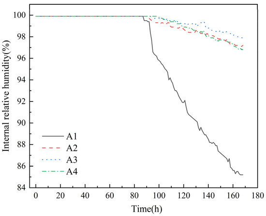 The experimental results of measuring the changes in relative humidity inside concrete over time with a high-precision hygrometer are shown in Figure 4.