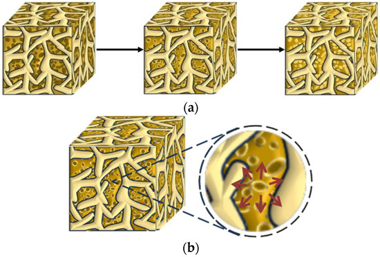 Common internal curing methods include internal curing with saturated lightweight aggregate (LWA) [13,14] and super absorbent polymer (SAP) [15,16,17,18,19,20,21]. These materials used as internal curing carriers can continuously release water loaded inside the concrete, maintaining a relatively stable internal humidity environment. Although the use of the above internal curing agents can reduce the shrinkage development of cementitious materials, it may lead to negative effects such as reduced strength of cement-based materials [22,23,24,25], unstable volume development, and poor economy. Therefore, it has been a major challenge in the field of engineering materials to achieve a balance between reducing the shrinkage development of cementitious materials and ensuring that the incorporation of internal curing agents does not reduce the mechanical properties of cement-based materials.