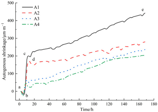 The autogenous shrinkage development of the control group (A1) could be divided into four stages: expansion-shrinkage-expansion-shrinkage, namely ab (brief expansion stage), bc (rapid shrinkage stage), cd (second expansion stage), and de (continuous shrinkage stage). The analysis of the deformation characteristics mechanism of the reference mortar at early ages is as follows. During the ab period, the control group mortar exhibits volume expansion. This is due to the mortar still being in a plastic flow state after pouring, with plastic settlement leading to vertical shrinkage and lateral expansion of the mortar. Moreover, the volume expansion rate caused by the hydration reaction of the cementing materials exceeds the shrinkage rate of the low water–binder ratio cement mortar, resulting in macroscopic volume expansion, with a peak expansion value of 20 μm/m. After the expansion deformation ends, rapid autogenous shrinkage occurs in the bc stage, with an increasing slope of the autogenous shrinkage curve. This is mainly because, during this period, rapid hydration reactions occur inside the cement mortar paste, releasing hydration heat. However, chemical shrinkage dominates over thermal expansion effects at this time, resulting in rapid shrinkage of the paste, with a peak shrinkage value of 200 μm/m. After this, the shrinkage curve exhibits a brief decline stage, where the cd stage shows a transient expansion process. This is related to the formation of ettringite, large-sized calcium hydroxide, and internal C-S-H during the hydration process [36]. The expansion-type hydration products offset some of the shrinkage, resulting in transient expansion. The reason for this brief duration is that the cement mortar with a low water–binder ratio has a dense structure without coarse aggregates, limiting the occurrence of expansion deformation. After the end of expansion deformation, the autogenous shrinkage of the mortar enters a gradual growth stage in the de period. The slope of the autogenous shrinkage deformation curve gradually decreases, becoming flatter, and the shrinkage increases slowly and steadily. The initial shrinkage value in this stage is 196 μm/m, and the autogenous shrinkage value at 168 h is 442 μm/m.