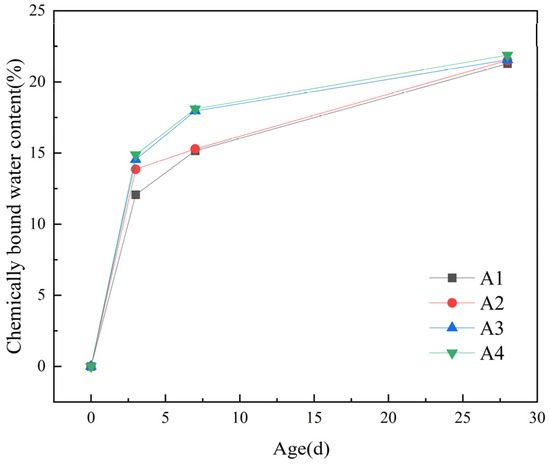From Figure 8, it can be observed that the chemically bound water content rapidly increases in the first 3 days. Compared to the baseline group (A1), the chemically bound water content in the groups doped with DE increased by 1.79%, 2.47%, and 2.81%, respectively. However, the growth becomes slower from 7 d to 28 d, with growth rates of 0.23%, 0.27%, and 0.6%, respectively. It can be seen that as the dosage of DE increases, the chemically bound water content of the cementitious material also increases. This can be attributed to two main reasons. Firstly, under the same water–binder ratio, the incorporation of DE releases water gradually when the internal relative humidity of the slurry decreases, which promotes the hydration of the slurry and thus increases the chemically bound water content of the hardened slurry. Secondly, in the middle and late stages of hydration (7–28 d), the pozzolanic activity of DE gradually takes effect. Under alkaline conditions, some of the reactive SiO2 and Al2O3 in DE react with the hydration product Ca(OH)2 of cement to produce secondary hydration products such as hydrated calcium silicate and hydrated calcium silicoaluminate, which increases the amount of hydration products and subsequently increases the chemically bound water content.