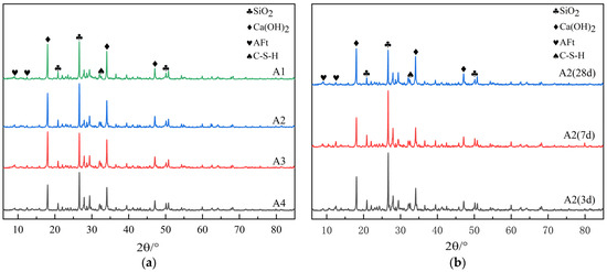 The hydration products of cement mortar mainly consist of Ca(OH)2 crystals and C-S-H gels. Among them, there are many types of C-S-H gels, most of which exist in an amorphous state in cement paste. It is difficult to detect C-S-H gels through XRD, but the changes in CH crystals are very obvious in the diffraction patterns. Therefore, to further analyze the impact of internal curing with diatomite earth on the hydration products of cement mortar, see Figure 9 for the XRD patterns of mortars with different dosages of DE and the XRD patterns of mortars with different ages after the addition of DE.