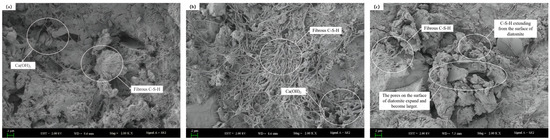 As shown in Figure 10, during the 3–7 d age period, a significant increase in C-S-H gel can be observed. At the 28 d age, a small amount of C-S-H gel was found on the surface of DE, which confirmed that DE participates in secondary hydration. Compared to the original scanning electron microscope image of DE, it can be found that the pores on the surface of DE transform into pore channels, leading to an increase in paste porosity, consistent with the mercury intrusion test results.
