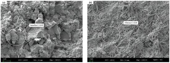 Figure 11 demonstrates a significant difference in the morphologies of C-S-H gel formed with and without the addition of DE. Without DE, the C-S-H gel is mainly in the form of flakes. However, with the addition of DE, the C-S-H gel appears as fibrous structures that intertwine and overlap. This difference is primarily due to the change in the calcium-to-silicon ratio of the paste after the addition of DE. As the calcium-to-silicon ratio increases, the particles transform from dense clumps on the surface to elongated fibrous structures [37]. Additionally, it can be observed that the microstructure without DE is denser with fewer pores visible, whereas the microstructure with DE exhibits a significant number of small pores and channels.