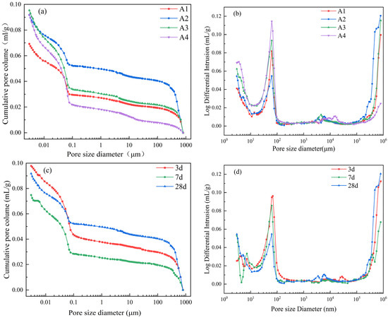 Effect of diatomite internal curing on pore structure of mortar. (a) Pore size distribution integral curves; (b) pore size distribution differential curves; (c) integral curves of pore size distribution at different ages; (d) differential curves of pore size distribution at different ages.