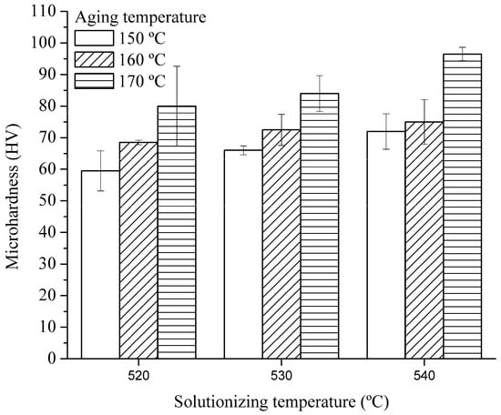 The hardness of an alloy is primarily attributed to the presence of GP zones and strengthening phases, as reported previously [36,37,38,39]. Notably, at a temperature of 540 °C, the precipitation of Mg2Si phases and GP zones is favored; then, microhardness values of up to 98 HV (SD = 2 HV) were obtained for these samples. In contrast, the lowest microhardness was observed for a solutionizing temperature of 520 °C.