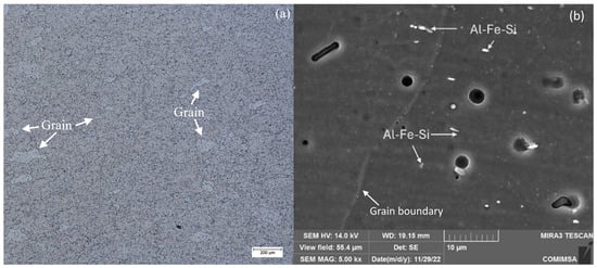 After the heat-treatment, the samples were removed from the furnace, and cross-sections were prepared to analyze their microstructure utilizing SEM. The microstructural results presented here correspond to selected samples from the tensile tests shown in Table 4. Figure 3 depicts the microstructure of the as-received alloy material. Equiaxed grains, characteristic of the 6061-T6 alloy, can be observed in Figure 3a; additionally, Figure 3b shows the presence of Al-Fe-Si dispersoids.