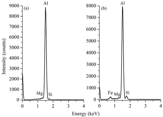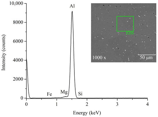 As-received material was also analyzed by EDS, and its spectrum is exhibited in Figure 4. It is worth mentioning that the sample exhibited some particles of Al-Fe-Si, as observed previously in Figure 3. However, EDS analysis revealed that Mg is also present in the metallic matrix, as well as traces of Si. The latter suggested the presence of other phases, mainly the β phase, as would be further confirmed by XRD (see Section 3.5). Small traces of Fe were also detected by the equipment.
