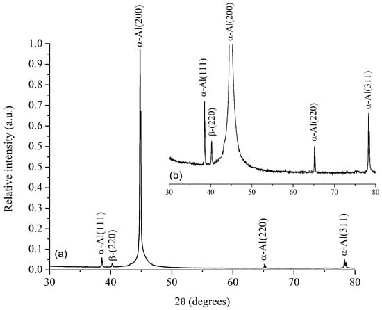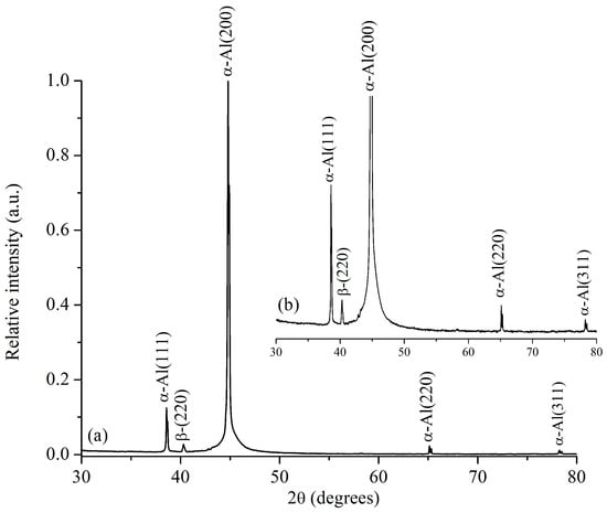Figure 9 presents the XRD pattern of a representative sample from the 7th run, subjected to a solubilization temperature of 540 °C for 3 h and aging at 170 °C for 18 h. It can be confirmed that the thermal treatment has induced recrystallization in the aluminum matrix. This is evident from the altered orientation of the aluminum diffraction peak initially observed at (200) in Figure 7. Furthermore, Figure 9 demonstrates a change in the relative intensity of other peaks, indicating the presence of the β phase in the alloy. According to the literature, the morphology of the β phase is typically observed in the form of plates or needles [11], as previously depicted in Figure 5, which corroborates the XRD findings. It is important to note that increasing the solution time can result in the dissolution of a more significant amount of the β strengthening phase, leading to increased hardening after the solution treatment [42]. Therefore, traces of the beta phase can be observed in Figure 7, Figure 8 and Figure 9.