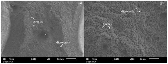 An interesting aspect of this study is the evaluation of the fracture mechanisms in the different experimental samples. First, we present the fractography shown in Figure 10, which corresponds to the sample from run 1, which exhibited the lowest UTS among all the samples. The fractographic analysis reveals the presence of microvoids, characteristic of ductile fracture. However, we also observe traces of cleavage, indicative of brittle fracture. Therefore, this sample exhibited a mixed fracture mechanism, combining both ductile and brittle features [43,44].