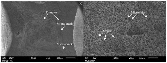In contrast, samples in the best condition (7th run, which reported the best performance in the tensile test, achieving the highest UTS result) exhibited different fracture mechanisms. The fracture was predominantly ductile, as indicated by the white arrows highlighting the presence of dimples and micro-cracks, which are characteristic of ductile fracture, as depicted in Figure 11a. Furthermore, Figure 11b, captured at 300× magnification, illustrates the presence of dimples and microvoids, reinforcing the observation that the specimen exhibits good ductility [8]. The rest of the samples, including the as-received materials, exhibit similar fracture behavior, demonstrating consistent ductile fracture characteristics across these conditions.