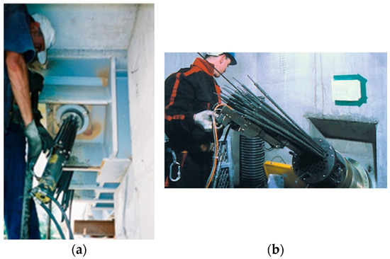Mono-strand jack usage for tensioning of the parallel strand stay cable using the ‘strand-by-strand’ technique: (a) pedestrian bridge over the Nišava river in Niš, Serbia [26]; (b) Seohae Grand Bridge, South Korea [27].