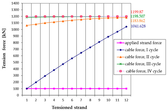 Individual tensioning of strands is performed in cycles (c = 1, 2, ..., m) always with the same force Zi(c) = Zu = Zk/n. In the last cycle, the forces in all strands are equalized, such that Zi(m) = Zu, Σ Zi(m) = Zk, ξk(m) = ξk, and (i = 1 ÷ n).