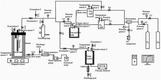 Figure 1 shows the schematic diagram of the experimental device. The gas-injection unit is composed of a gas storage tank, pressure gauges 1 and 2, valves V1 and V2, a booster pump, air compressor pressure gauge 3, and valve V3. The hot-mixing unit includes valves V4 and V5, the CO2 tank, a N2 tank, temperature sensors 1 and 2, pressure sensors 1 and 2, one-way valves 1 and 2, pressure sensor 3, temperature sensor 3, valves V6 and V7, pressure gauge 4, and a gas-mixing tank. The static-mineralization unit includes valves V8 and V9, flow meter 1, temperature sensor 4, pressure sensor 4, vent 1, pressure gauge 5, a static reactor, a condenser, valve V10, a discharge port, and a flue gas analyzer. The vacuum-extraction unit consists of a vacuum pump, pressure gauge 6, vent 2, valves V11 and V12. The dynamic-mineralization unit includes valves V13 and V14, vent 3, an ultrasonic stirred tank, temperature sensor 5, pressure sensor 5, a stirring tank, and a magnetic stirrer. The steam unit comprises a steam generator, a water-injection pump, a steam-flow meter, a discharge valve, and valve V15.