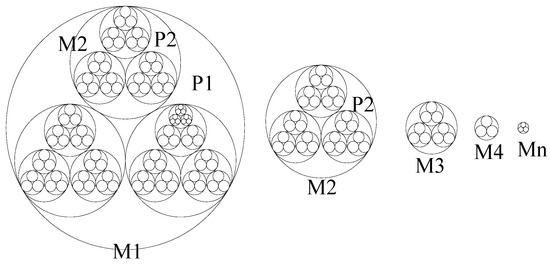 Figure 2 showcases the microstructure of fly ash, captured using a scanning electron microscope (SEM). The black part in the image represents the pores, while the white part represents the fly ash particles. Fly ash, being a porous medium material, contains matrix, pore, and crack structures of varying sizes, exhibiting a multi-scale characteristic in space. It is assumed that the fly ash particles are isotropic spheres. When a cross-section is taken through the center of the sphere, the spherical fly ash reveals a multi-scale structure, with larger circles encompassed by smaller circles, as illustrated in Figure 3.