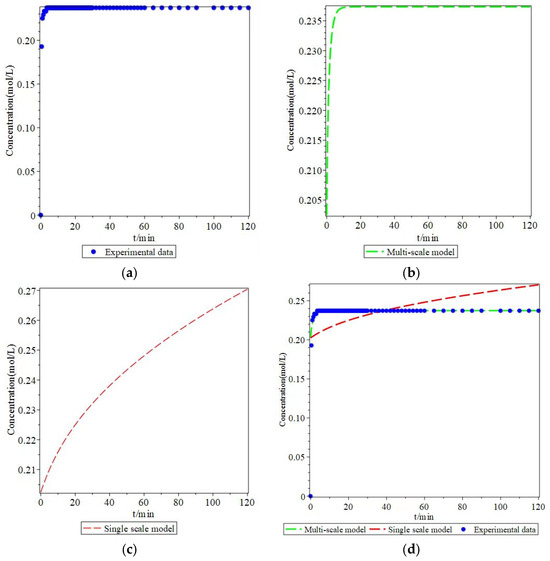 During the experiment, real-time detection of the pH value of the liquid environment was conducted. By establishing the conversion relationship between the pH and ion concentration, the relationship between the concentration of alkaline ions in the solution and the soaking time was determined (Figure 4a). Each data point in the figure represents the ion concentration at different time intervals during the experiment. Figure 4b,c display the fitting curves of the model at both multi-scale and single-scale levels, respectively. Both curves indicate that the dissolution and diffusion rate of fly ash decrease over time. However, the single-scale model shows a relatively slower change in the ion concentration as time progresses, while the multi-scale model demonstrates a rapid increase in the ion concentration followed by fast dissolution and diffusion in the early stage of the reaction. Figure 4d illustrates that, under the same conditions, the results calculated by the model align with the experimental findings, confirming that the model effectively predicts the evolution of alkaline ion concentration during the dissolution and diffusion process of fly ash. A comparison and verification were performed among the single-scale model, the multi-scale model, and the experimental data. The results show that the single-scale model fails to accurately match the experimental results, indicating its inability to properly calculate and describe the evolution of ion concentration in the dissolution and diffusion process of fly ash.
