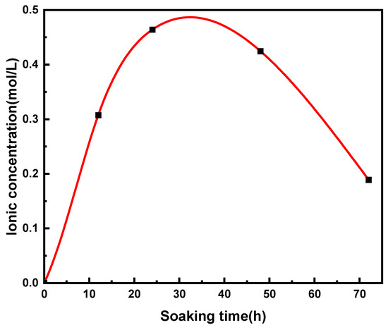 According to the kinetics of mineralization reactions, the concentration of alkaline ions that are leached and dissolved in fly ash corresponds to the mineralization reaction product. As a result, the leaching and dissolution rate of alkaline ions directly impact the chemical reaction rate of mineralization. Section 3 reveals that the multi-scale effect of micro–nano pores in fly ash is the primary factor that restricts the leaching and diffusion rate of alkaline ions. However, the relationship between alkaline ions and micro–nano pore size cannot be characterized at a macro level. Instead, the leaching rate of alkaline ions in fly ash is influenced by pore size at the micro level, exhibiting dynamic changes over time at the macro level. Therefore, this research now focuses on discussing the relationship between alkaline-ion leaching concentration and time, and subsequently, the relationship between mineralization efficiency and time. Changes in the concentration of alkaline ions not only affect mineralization efficiency but also impact the structure and mechanical properties of the material. Consequently, this article conducted further analysis to examine the relationship between the ion leaching concentration and the material structure, as well as its mechanical strength.
