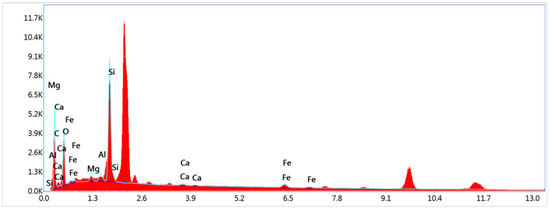 Figure 8 and Figure 9 present SEM photos and the energy spectra of samples with different soaking times, illustrating the carbonization products. The original fly ash particles exhibit a relatively smooth surface with a regular spherical shape, along with a small number of attached tiny particles composed mostly of soluble substances and quartz. After 24 h of soaking, the particle surface gradually changes from smooth to rough, with the appearance of aggregated precipitates, indicating the dissolution of a significant number of alkaline substances. After 48 h of soaking, an increased presence of silicate (CSH) can be observed, potentially an intermediate product of fly ash hydration, with continuous formation and precipitation of disordered precipitates on the particle surface. The EDS analysis revealed that the main components of the precipitate were Si, Mg, Al, and Ca. After 72 h of soaking, the original fly ash particles become covered by a dense layer of hydration products, and the fly ash spheres are filled with sediment. As the hydration reaction products continue to generate and cover the particle surface, a layered hydration product layer forms, enclosing the products. The longer the soaking time, the denser the generated carbonate becomes, promoting the improvement of compressive strength. Additionally, more silicates (CSH) can be observed, which may indicate the intermediate products of fly ash hydration. During the subsequent curing process, the carbonate of the mineralized specimen gradually becomes enclosed and cemented by CSH, effectively filling the product’s pores.