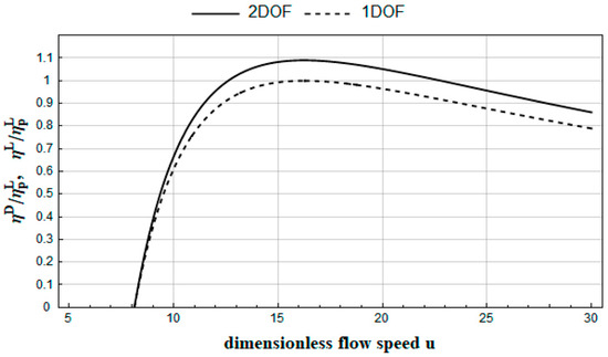 Clearly, according to Equation (41), the discussed system with two degrees of freedom will have greater efficiency than the reference system if and only if